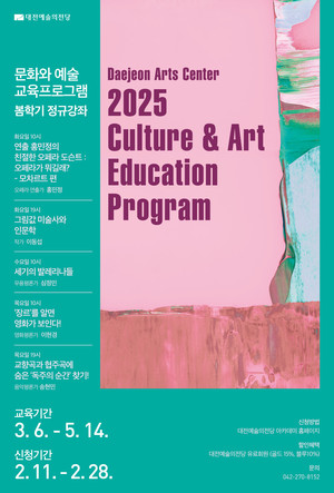 대전예술의전당(관장 김덕규)은 2025년 예술아카데미 문화예술 교육프로그램 봄학기 강좌 수강생을 오는 28일까지 모집한다고 11일 밝혔다. 모집은 대전예당 홈페이지에서 선착순으로 진행되며 5개의 정규 강좌가 마련됐다.강좌의 내용은 '그림값 미술사와 인문학(이동섭 강사)', '오페라가 뭐길래? 모차르트편(연출가 홍민정)', '교향곡과 협주곡 속 숨은 독주의 순간 찾기(송현민 강사)', '세기의 발레리나들(심정민 강사)', '장르를 알면 영화가 보인다!(이현경 강사)' 등이다. 김덕규 관장은 "대전예술의전당은 지속적으로 다양한 문화예술