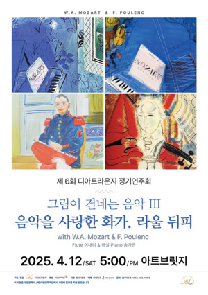 ‘빛과 색채 화가’로 유명한 라울 뒤피의 그림과 오스트리아 태생의 천재 음악가 모차르트의 음악이 만남을 상상할 수 있는 연주회가 펼쳐진다.디아트라운지(대표 송가은)는 내달 12일 오후 5시 대전 아트브릿지에서 ‘제6회 디아트라운지 정기 연주회’를 개최한다고 27일 밝혔다.디아트라운지는 2019년에 창단한 전문 연주단체. 전문적이고 깊이 있는 피아노 앙상블 레퍼토리 연구를 통해 새로운 장르, 악기와의 협연과 다양한 인문학적 시도를 해왔다. 올해 연주회는 ‘음악을 사랑한 화가, 라울 뒤피’를 주제로 열린다. 지난해에 이어 올해도 송가은
