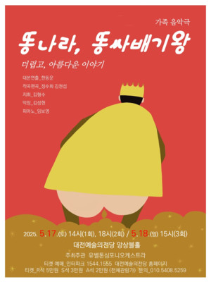 5월 가정의 달을 맞이해 온 가족이 함께 즐길 수 있는 음악극 '똥나라, 똥싸배기왕'이 내달 17~18일 이틀간 대전예술의전당에서 열린다. 똥나라, 똥싸배기왕은 변비에 걸린 왕이 똥나라의 위기를 극복하는 과정을 유쾌하게 그린 어린이 창작극이다. 의사 진찰, 최면, 장에 좋은 음식 등 온갖 방법을 동원하지만 문제는 한 가지 음식만 고집한 식습관. 결국 영양소가 고루 담긴 엄마의 밥상 덕분에 황금똥을 누고 나라에 다시 풍요가 찾아온다는 교훈적인 메시지를 담았다. '똥구린내', '굵은똥', '똥파리', '알랑방귀' 등 유쾌한 이름의 캐릭