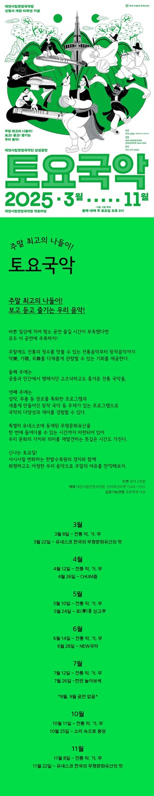 토요국악 행사가 매월 둘째, 넷째 토요일 오후 2시부터 2시간동안 대전시립연정국악원 작은 마당에서 펼쳐진다. 3월부터 열리는 토요국악 행사는 둘째주 궁중과 민간에서 행해지던 고즈넉하고도 흥겨운 전통 국악을, 넷째 주에는 창작 국악으로 다양한 재미와 경험을 선사한다. 토요국악은 7,8월을 제외하고 11월까지 진행된다.6월 행사는 14일 전통 악, 가, 무 28일 NEW국악을 주제로 열린다.14일 프로그램은 세악 합주 '천년만세', 가야금 독주 '최옥삼류 가야금 산조', 대금·가야금 중주 '메나리', 판소리 흥보가 中 '박 타는 대목'