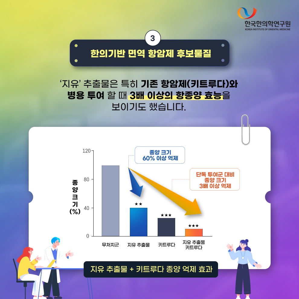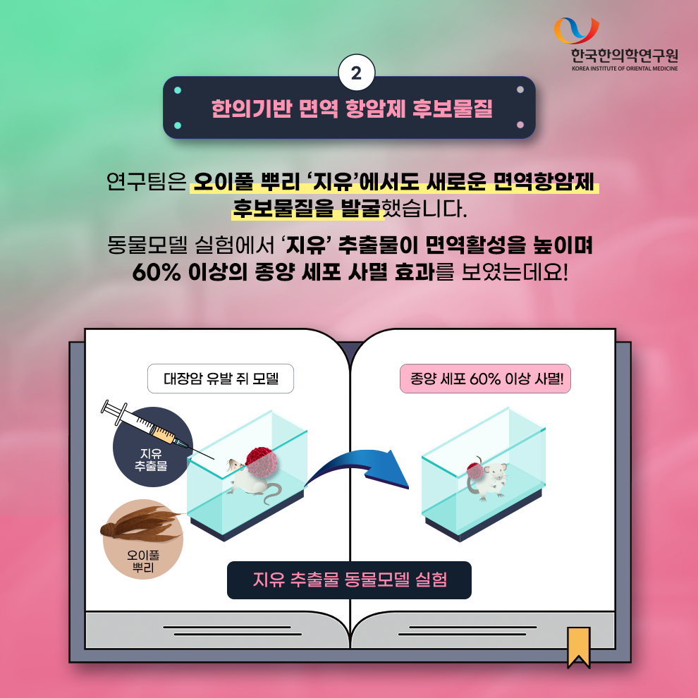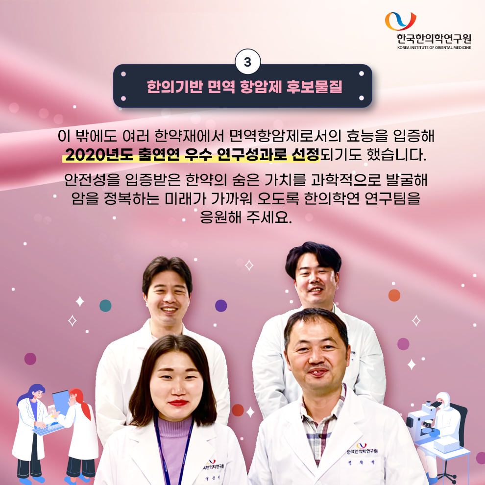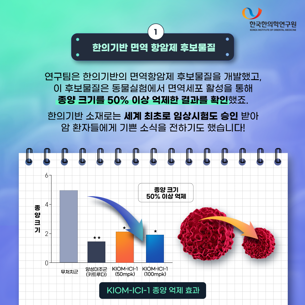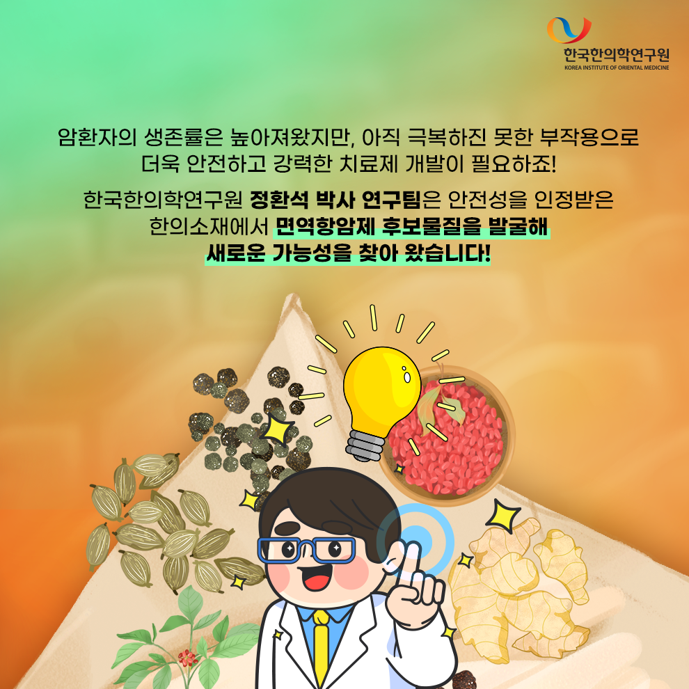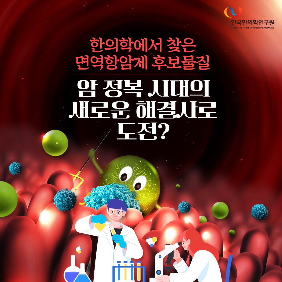 한국한의학연구원에서도 면역항암제 후보물질 발굴에 노력하고 있는데요. 오늘은 한의소재에서 새롭게 발견한 면역항암제 후보물질에 대해 카드뉴스로 소개해드립니다.